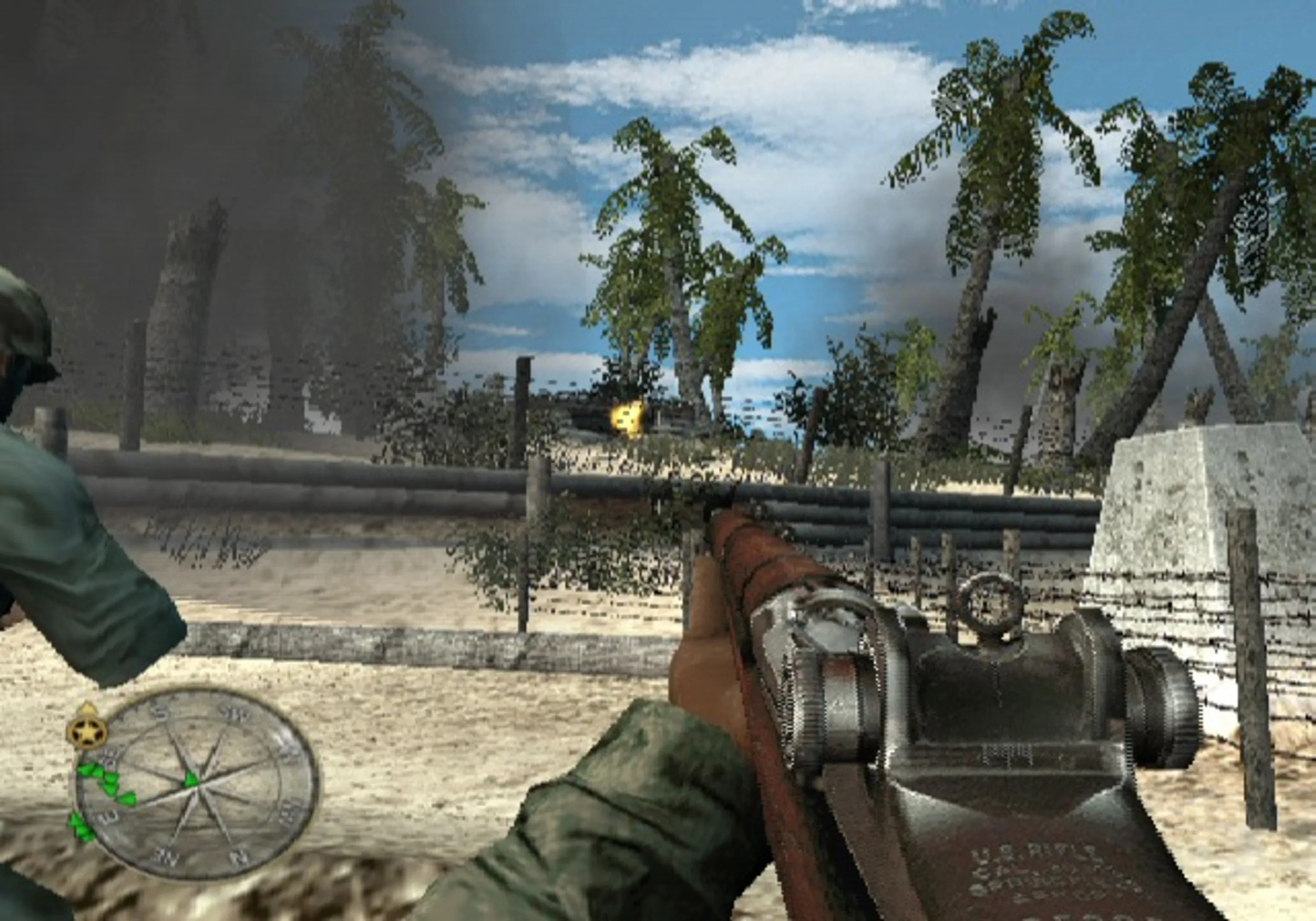 The second you enter the first level, hell, even the tutorial, it becomes clear things are very wrong. Without even being in the true World at War into the conversation, Final Fronts looks significantly worse than the previous PS2 console entry in the series, Call of Duty 3, an issue that grows more disturbing once you realise this game came out at the tail end of 2008, where some of the most beautiful PS2 games were coming out. Textures are ridiculously blurry and undefined, with rough character models for both your ride-or-die buddies and the endless hordes you’ll be cutting through. It’s a genuinely horrendous looking game, with almost no real definition nor variation across its locales; it’s almost always ‘Japanese-occupied jungle’ or ‘snowy, German-held city’. You can count the pixels of the sky above you, and the visuals of the cover you’ll frequently be hiding behind don’t match their hitboxes - spraying a full clip of ammo into an enemy who was CLEARLY peeking over the edge of cover to no effect never, ever feels good. It’s a game that is very, very clearly made on a budget and a tiny timescale, as whilst everything functions, very little functions particularly well.