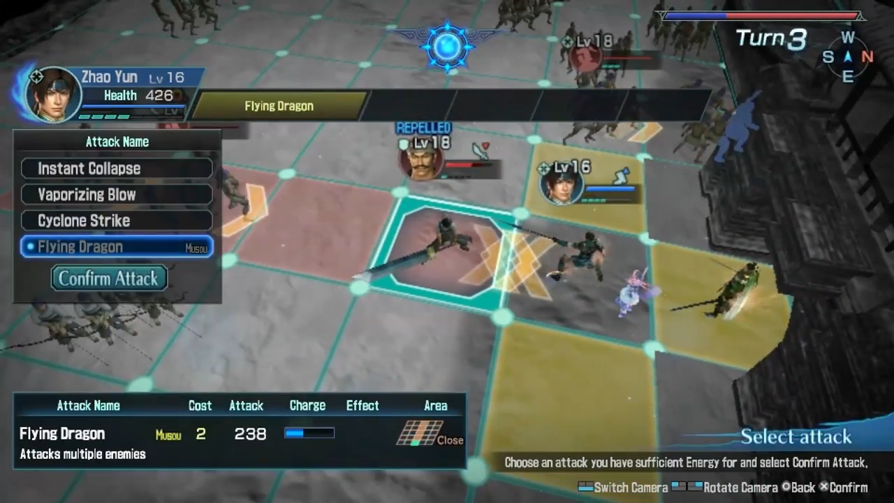 Most characters fall into various archetypes with different ranges and attack spread. For example, Zhao Yun specializes in hitting hard in narrow columns, whilst his best friend Lei Bin has weaker, but larger Area-Of-Effect attacks that’ll debuff many foes at once. Most uniquely to the genre, each unit is not limited to a single attack at a time, so you can attack as many times as you have the AP to sustain them, creating opportunities to focus down a particularly problematic target or weaken units for other heroes to dispatch them. In addition, they’ve got their Musou Attacks, a devastating ability that can only be used once their Musou gauge is filled after dealing enough damage.