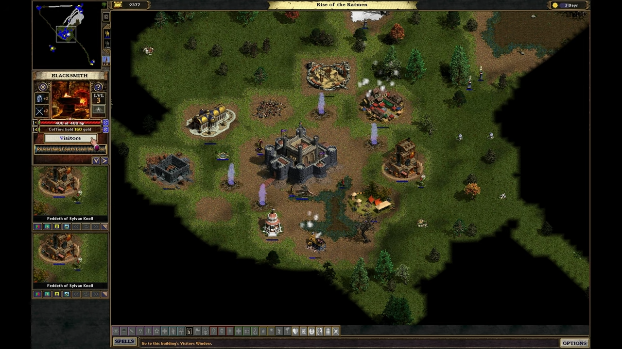 But where do you get gold from? Rather than earning resources from specific locations, like in most RTS, Majesty has a kind of in-built economy loop. Heroes will generally earn and generate gold by wandering and killing across the world, and so you’ll need to build marketplaces and blacksmiths, along with other, similar buildings, for them to purchase supplies and weapons for further journeys. That money is then stored within these buildings, before a town tax collector will come from your castle and collect the money, adding it back to your stockpile and allowing you to spend more money on heroes, upgrades, and other typical RTS progression. Gold can also be spent to cast spells unavailable to your heroes, exclusive to you, the ruler, unlocked by building certain structures associated with the spells. These can range from devastating offensive spells to potent buffs and heals - or even resurrections - to specific units, but using more than a few will evaporate your gold reserves in an instant, making using them a painful balance best suited for all-in strategies, or emergency defense.